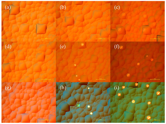 Optical microscopy images of the samples passivated by Al2O3 and/or TiO2 layers: (a–c) Al2O3 single layer, (d–f) 20-nm-thick and (g–i) 50-nm-thick TiO2 on Al2O3 layer. Samples (a,d,g) have a 10-nm-thick Al2O3 layer, (b,e,h) 20-nm-thick layer and (c,f,i) 30-nm-thick layer. The scale bars represent 100 μm.