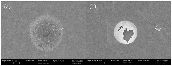 For Al2O3 films with thicknesses of less than 10 nm, there were no blisters even when capped with a thick TiO2 layer with a thickness of up to 50 nm. For stacks capped with TiO2, blisters appear in 20-nm-thick Al2O3 films. For example, an Al2O3 single layer more than 30 nm in thickness contained blisters, as did a stack composed of a relatively thinner 20-nm-thick Al2O3 layer capped with a 50-nm-thick TiO2 layer. When an Al2O3 film is thick, the blisters will coalesce and grow over a longer period of time. At a temperature of 200 °C, where atomic layer deposition takes place, the Al2O3 film contains a considerable quantity of hydrogen in the form of OH bonds. After annealing above 500 °C, the hydrogen concentration of the film decreases from an initial value of 10% to 2–3% [26]. This annealing causes the out-diffusion of excessive hydrogen included by atomic layer deposition, which is more predominant in a thin film. In addition, hydrogen may be released during atomic layer deposition due to a reaction between the hydroxyl group in H2O and the titanium precursor, TiCl4, despite the low hydrogen content of approximately 0.4 atom% in the TiO2 film deposited at approximately 200 °C [27,28]. When the TiO2 layer lies on top of the Al2O3 film, the hydrogen is unlikely to diffuse out and accumulates at the point of blister nucleation such as the grain boundaries. Chemical etching of the passivation layers Al2O3/TiO2 is possible, resulting in circular silicon voids approximately the size of the blister.