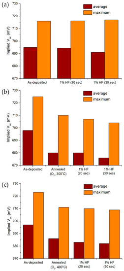 Implied open circuit voltage of samples passivated by the Al2O3/TiO2 stack after etching with a 1% HF solution: (a) no annealing and (b,c) 300 °C and 400 °C annealing in O2 ambient.