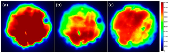 Photoluminescence images of the samples passivated by Al2O3/TiO2 stack after 1% HF etching for 30 s: (a) no annealing and (b,c) 300 °C and 400 °C annealing in O2 ambient.