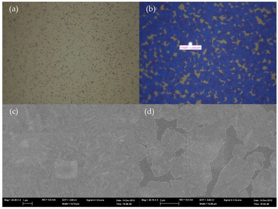 Optical microscopy images of samples passivated by Al2O3/TiO2 stack after 1% HF etching for 30 s: (a) bright and (b) dark area in photoluminescence. (c,d) isSEM images of (a,b), respectively. (b) The pinhole has a diameter of 3.48 μm and (c,d) the scale bars represent 2 μm.