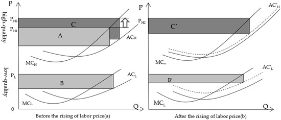 At the same time, the repeated transactions often depend on a series of features of farmers, such as good interpersonal relationship of farmers, providing better services for buyers, or establishing brands in order to facilitate the identification of purchasers, thus inevitably increasing the sales cost of farmers. The features of farmers not just require additional charges, but also lead to a different share of production cost, especially the decreases of cost share of fine management techniques that require intensive labor and have labor-intensive properties. The different share of labor cost leads to the variations of average total cost. When labor cost rises, the increase of the average production cost of high-quality fruits (the average cost curves change from ACH to AC’H) is less than that of the low-quality fruits (the average cost curves change from ACL to AC’L), as shown in Figure 1b.