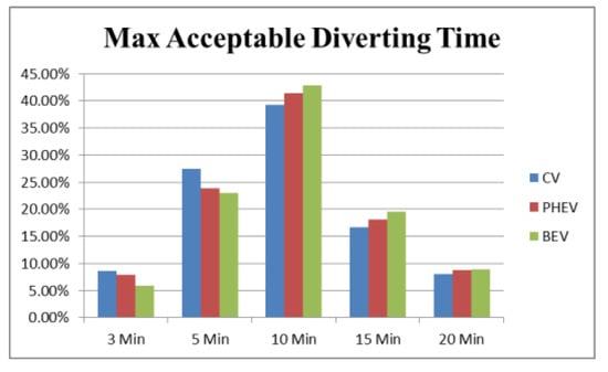 - BEV. BEV drivers with higher individual income are more likely to choose 3 min or 15 min as their maximum acceptable diverting times, as evident from both the z values and the relationship shown by Figure A3 (in Appendix B). Again, this may be because some of the people with higher income would like to save more time, and the others may have a stronger desire to use electricity because of their higher environmental awareness.