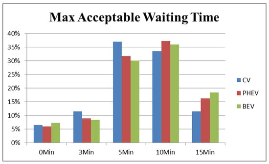 Drivers may have to queue at a refuelling station, especially during the peak period. They may not choose those refuelling stations with too many vehicles queueing. Therefore, respondents were also asked about the maximum acceptable waiting time at a refuelling station. The waiting time may vary from one to another and also differ between CV and EV drivers. The respondents were given three scenarios in which they were assumed to drive CV, PHEV and BEV, respectively. Their choices were also related to their individual and household attributes, and the differences between CV and EV drivers were compared.
