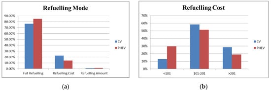 Essentially, drivers may choose one of the following three modes to refuel their vehicles: Full refuelling, refuelling with a specific cost and refuelling with a specific amount of fuel. It can be found from Figure 3 that CVs and PHEVs differ in refuelling mode and cost when they refuel their vehicles at a refuelling station. In terms of refuelling mode, full refuelling is most frequently chosen for both vehicle types, accounting for about 77% and 85% for CVs and PHEVs, respectively. The refuelling amount chosen is only around 1% for both. The reason why more PHEV drivers want to fully refuel may be because they have some electric range and thus visit the petrol station less often. For refuelling cost, most people spend money ranging from 101 to 201 RMB on refuelling each time, but PHEVs tend to spend less. This may be because PHEVs would like to save money and try to get their vehicles recharged at their trip destinations with slow charging posts, for example, at home and workplaces (note that PHEVs can save cost by running on electricity instead of petrol).