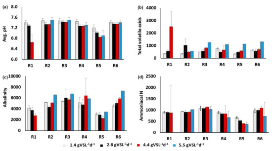 Figure 1a shows the average pH of each reactor at different OLRs. In R1, the daily pH dropped to 6.2 on the seventh day from an initial pH of 7.3 at OLR of 4.4 gVSL−1d−1. The pH drop caused reactor failure and led to an excessive CO2 fraction in the produced biogas. The reactors with acid whey (AW), waste bread (WB), energy drink (ED), and cow manure (CM) as co-substrates maintained the daily pH between 7.3 and 7.5 throughout the experimental duration. There were no major issues with process stability with these co-substrates. With paper napkins as the co-substrate (R5), the reactor pH varied between 6.8 and 7.3 at different OLRs. However, pH variation was minimal at each OLR, indicating a steady process. If the pH drops below 6.8, it is advised to reduce the OLR as lower pH values correspond to VFA accumulation and imply the reactor is undersized for a given OLR. Analyzed at discrete time intervals, the pH of all the digesters reduced by 0.2 to 0.3 units immediately after feeding, and recovered within 2 h.