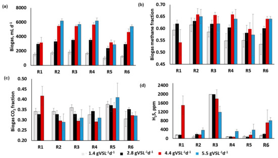 The average daily biogas production rate and methane, carbon dioxide, and hydrogen sulfide composition of biogas are shown in Figure 2a–d. In R1, the average methane level reached a high of 62% at 2.8 gVSL−1d−1 but was reduced to 44% at 4.4 gVSL−1d−1, indicating a need to stop feeding and let the reactor stabilize for several days to attain a normal methane production level. In R2, the methane level reached as high as 71% at 4.4 gVSL−1d−1 with a daily average of 66%, and this reactor maintained greater than 62% average methane concentration throughout the measurement period. With energy drink (ED) as co-substrate in R3, the biogas contained a high concentration of H2S, even though it showed higher methane levels of 60 to 66%. With ED as co-substrate, the H2S concentration was greater than 2000 ppm for the first two OLRs and reduced to 1194 ppm at 5.5 gVSL−1d−1. The average daily H2S concentrations ranged from 78 to 83 ppm for R2, 82 to 326 ppm for R4, 91 to 391 for R5, and 139 to 810 ppm for R6 within the safe operating OLR region. The H2S levels of R2, R4, and R5 were significantly lower than R6.