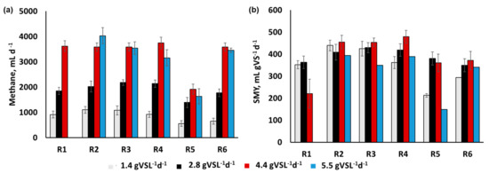(a) Daily average methane production rate [mL d−1]; (b) Specific methane yield (SMY) [mL gVS−1d−1]. Co-substrates: R1—none; R2—AW (acid whey); R3—ED (energy drinks); R4—WB (wasted bread); R5—PN (paper napkins); R6—CM (cow manure).