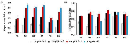Biogas productivity is an indicator of process stability and must be monitored on a regular basis. Reactors R2, R3, and R4 showed increasing productivities with increasing OLR up to 4.4 gVSL−1d−1 (Figure 4a), and productivity either reduced or remained the same at a loading of 5.5 gVSL−1d−1 for all reactors except R2 and R6. No further increase in productivity indicates the onset of reactor overload and implies that the OLR should be reduced to maintain stable operation. The productivity in R1 did not increase further after an OLR of 2.8 gVSL−1d−1, and the productivity decreased in R5 at the highest OLR tested. Therefore, it is suggested that OLRs be kept below 4.4 gVSL−1d−1 when acid whey, bread, and energy drinks are used as co-substrates with CFW, below 2.8 gVSL−1d−1 when co-digesting CFW with cow manure and paper napkins, and between 1.4 and 2.0 when digesting CFW alone. The degradability or percent degradation signifies waste management efficiency because it is directly proportional to the amount of food waste converted into biogas. All the reactors had a lower biodegradability at the highest OLR, as indicated in Figure 4b. A significant improvement in biodegradation from 1.4 to 2.8 gVSL−1d−1 was observed in all the reactors. However, at 4.4 gVSL−1d−1, only R2, R3, and R4 had higher COD removal. The COD removal reduced in all the reactors at 5.5 gVSL−1d−1 except for R5.