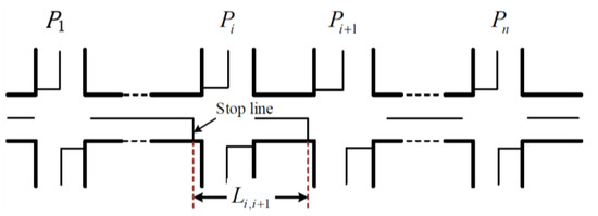 Suppose that the arterial system as shown in Figure 2 has a total of n intersections, respectively denoted as , … , , …, . West to east is the eastbound direction and east to west is the westbound direction. is the distance between adjacent intersections and with the unit of m.