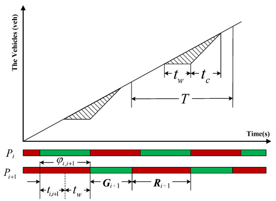 The shaded area in Figure 2 shows the eastbound delay between intersections and , denoted as in the unit of s. can be calculated with Equation (16).