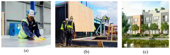 Case study 3 construction phases of the pioneering sustainable development (credited to CITU [43]). (a) components production in factory, (b) site assembling, (c) final view.