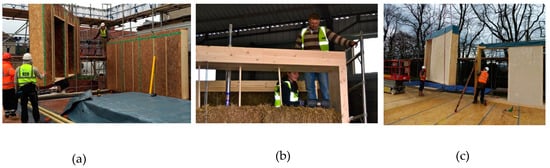 Case study 4 timber-framed panels insulated with straw bale (credited to Modcell). (a) wall installation, (b) straw filling, (c) on site installation and waterproofing.