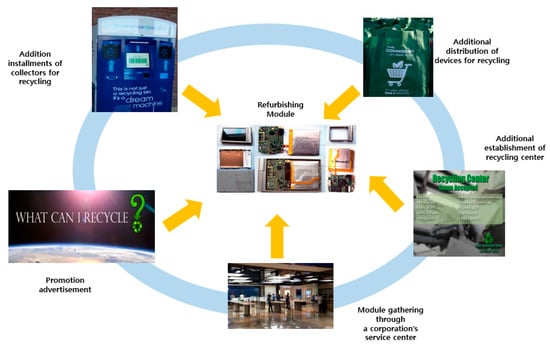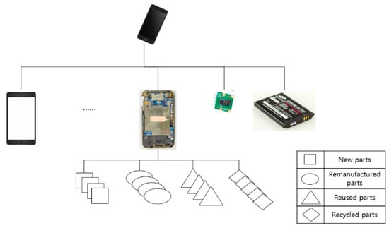 As shown in Figure 2, the refurbished product is manufactured and assembled while using various types of components, coupled with a variety of remanufacturing methods. This study also investigates the effective proportions of newly manufactured components and recycled components. The effective proportions of manufacturing components that were based on this research indicate that an efficient manufacturing BOM comprise of subcomponents with less production costs that meet the customers’ needs. This paper is distinguished from other studies due to the consideration of gathering strategies while there are numerous related research studies on remanufacturing and recycling economy: extended advertisement, and additional installation of collecting facilities and incentive policies, as illustrated in Figure 1. While other studies only focus on the effective use of the already returned components, this paper considers the potential cost of returning components while using these investments. More collection may be achieved if these investments are effective, hence contributing more to circular economy. For this reason, the proposed framework is considered to be a more active strategy to support circular economy.