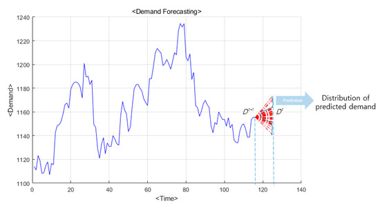 This research focuses on the effective gathering investment strategy while considering the existing returned volume, the predicted return rates, and an estimated demand. The demand () is determined while using previous market data and forecasts. Since various uncertainties are embedded in its prediction, it is only rational that the demand be represented while using a probability density function. Figure 4 shows the estimated that is represented using a probability distribution.