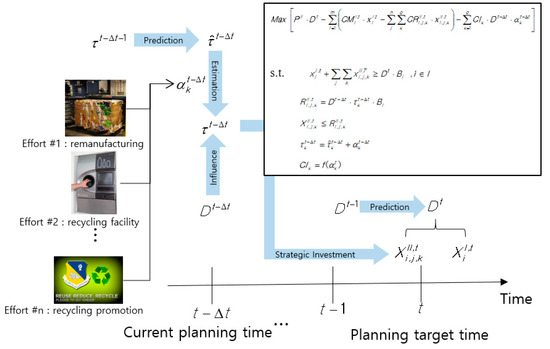 However, most of the research studies ignore investments and the relevant activities that enhance the product circularity. Existing research studies examine a production planning while using already recycled products or an estimation of the amount. While the additional investments for increasing return rate for End-of-Life (EOL) part are comparatively ignored, they establish mathematical programming models within fixed ranges of the returning rates. Consequently, the subsequent uncertainties (e.g., customers’ uncertainty and modeling parameters) are modeled into fuzzy logic-based mathematical programming or nonlinear programming models. As described in the previous section, the existing studies fail to incorporate efforts for enhancing products’ or modules’ circularity in their production planning. In this paper, these strategies are classified as “passive investment strategies for remanufacturing”. The efforts or investment to enhance return rates for EOL parts are needed in order to actively enhance CE. However, the bulk of the existing papers have ignored these efforts and their economic analyses. As a result, this paper suggests an integrated framework that simultaneously considers existing production constraints and investments for the refurbished product’s circularity. For this concept, the proposed framework is classified as “active investment strategies for remanufacturing”.