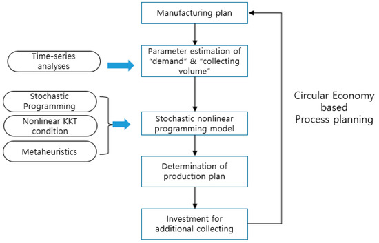 Figure 6 shows a flow diagram for implementing the proposed circular economy-based process planning. The accurately predicted demand () and the collecting volume () heavily influence on the solutions and analyses of the proposed model. The estimations of and are estimated while using the current manufacturing plans and data, and are mainly driven using a time series technique. This research utilizes Autoregressive Integrated Moving Average (ARIMA) method or other nonlinear prediction methods for covering nonstationary data. The analyses of many research studies [22,23,24] assumes that most of the production demands and manufacturing related tendencies follow the nonstationary stochastic characteristics. Although can be monitored or directly estimated while using one of those methods, is predicted using several existing time-series methods that enhance the accuracy of these estimations. These values are then represented while using a random variable following a Gaussian distribution . Both parameters and are estimated while using the predicted results from several time-series methods. Instead of the single value-based prediction, the application of this probability distribution enhances the representation power of the estimated demand. can then be replaced with (9) while using a stochastic programming through recourse model with the bounds.