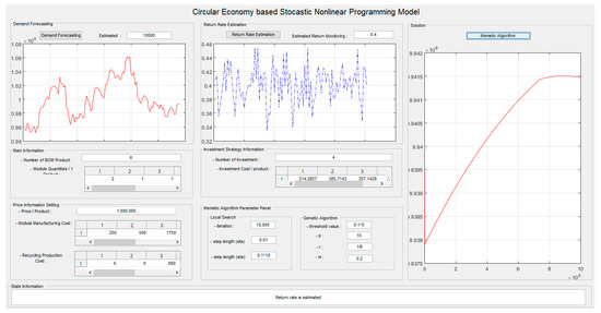 The overall solution procedure for the proposed model combines the Genetic algorithm that is shown in Table 4 with the gradient based local searching provided in (14), (15), and (16). During these processes, is projected while using the sample averaging approximation method. The mathematical model provided and the stochastic nonlinear programing based method contributes to the estimation of effective collecting strategies. As the reputation of circular economy grows more and more, production/collection quantities and related BOM portions become crucial decision factors. The relevant collecting investments, together with their budget strategies, have to be considered in this model. The proposed framework is considered as an effective remanufacturing in support of the circular economy. The ensuing section describes the developed remanufacturing systems and its numerical studies’ analyses.