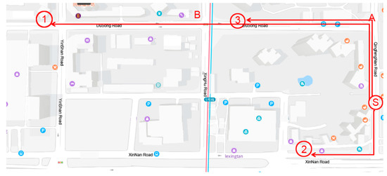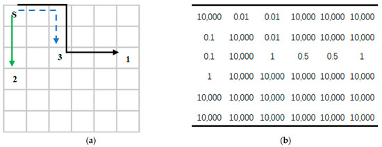 In Figure 1, the three red circles with numbers denote the optional charging stations. For simplicity, we supposed a concurrent charging request happening at the same place where the circle is labeled with “S”. We considered three routes—one for each station. According to the Baidu Map, the distance ratio between S and the three stations was 6:3:4. Each grid represents one distance unit. We formed the grid world as shown in Figure 2a, in which the relative positions of the three stations to the requesting location can be expressed. Roads from “S” to each station are set as lines in Figure 2a according to their distance ratio. We obtained the real general congestion status by the congestion indicator. The general congestion situations on these roads were set as the initial reward for related grids, as shown in Figure 2b. The data show that the most congested road segment was B1, while the least congested one was S3, where B is one cross point on the way to Station 1. For those grids in which optional stations were deployed, the initial statuses were set as 1 to 10,000.