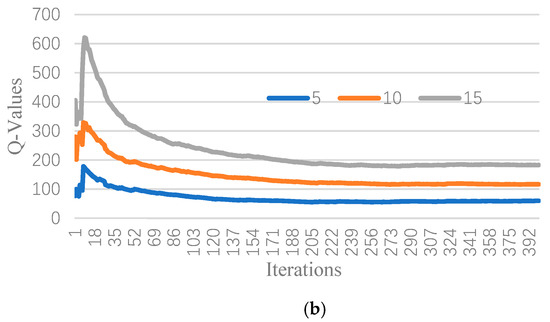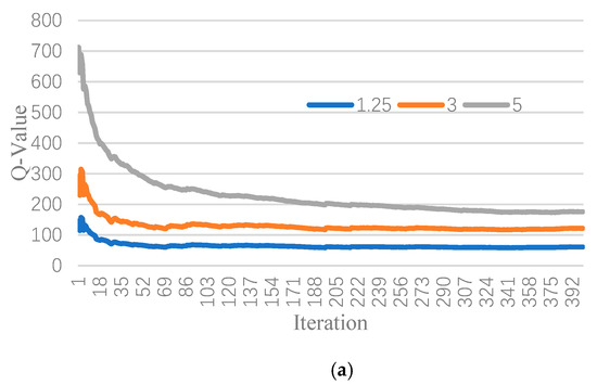 In Figure 5a, the three curves represent three kinds of road capacity—1.25, 3, and 5. The convergence trends in these three curves are the same. However, there are relatively large differences in the initial Q-Value. The smaller the , the smaller the initial Q-Value.