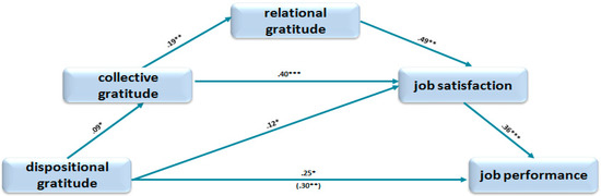 The tested serial mediation model is represented in Figure 2, where only the significant relations are reported; more specifically, collective gratitude does not have a direct relation with job performance, nor the dispositional gratitude with the relational gratitude.