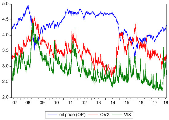 In this study, the data sources were from Federal Reserve Economic Data, (FRED), which covered 2750 observations over 10 May 2007 to 22 April 2018. For studying convenience, all the variables surveyed were in natural logarithm, and Eviews 9.0 was used as the analysis software for this study [37]. The time series graphs for Brent oil price (OP), OVX, and VIX are shown in Figure 1.