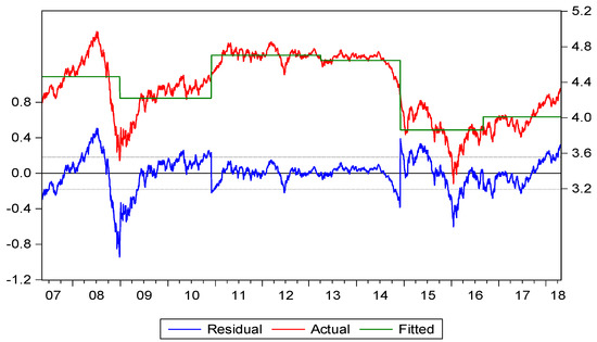 Based on this reasoning, we used the multiple structural breaks approach proposed by [52] (Here, we used the Global L breaks vs. none method under the Bai and Perron (BP) model to detect structural changes in oil prices. Please see [52]). As shown in Table 5, there were five structural breaks caused by several major international political and economic events during the sampling period. The process of structural change concerning oil prices is described briefly in Figure 2 as follows. The first break was that in December 2008, due to the widespread global financial crisis, oil prices fell to the lowest price since 2004. Then, followed by the second break, the pressure of dollar depreciation since the implementation of QE2 in December 2010 gradually increased, and tremendous dollar funds evacuated from the US into the speculative markets of crude oil [53] making oil prices to rise to a new high since the financial tsunami. In April 2013, the third break occurred where the United States launched automatic spending cuts, which severely challenged economic recovery. The IMF’s revised global economic growth rate in 2013 and the weak economic data in China and the US all indicated that the global economic outlook remained fragile. At the fourth break in December 2014, the European Central Bank conducted a number of easing policies, the issue of independence in Scotland strengthened the US dollar, and the oil price fell even more [54]. Afterward, the prices of the three major international oil price indicators fell to a level below US $100 per barrel. The OPEC has once again maintained its production target and, thus, stimulated a major decline in international oil prices. In January 2016, the results of the OPEC semiannual meeting revealed that the oil-producing countries lacked a consensus on production, and the US announced that it would abolish the crude oil embargo, which caused the international oil market to seriously worry about its oversupply problem, further dragging down oil prices and touching a new low level ($26) since the tsunami. In September 2016, it slowly rebounded slightly above the fifth break, a recently crucial point ($45). We can see that there were major events before and after every structural breaking point, which caused the oil price to rise or fall sharply.