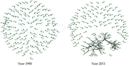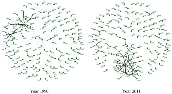 Figure 4 show digraphs of the FTA and PA networks in 1990 and 2011, respectively.