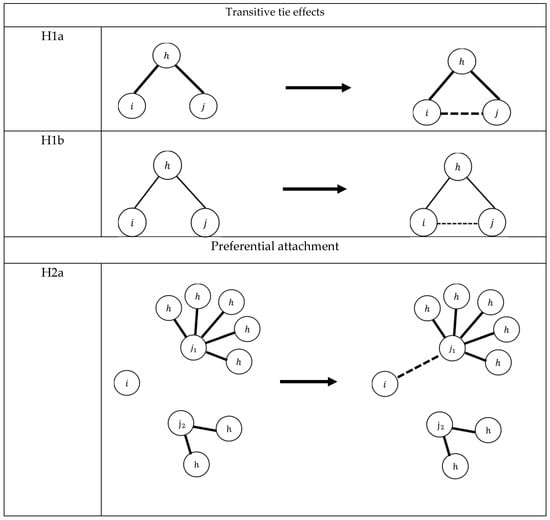 This subsection explains two structural effects within a network: transitive ties and preferential attachments. Transitive ties and preferential attachments could be the most common endogenous network effects because of the importance of third parties and popularities in network evolution. First, concerning transitive tie effects, several studies have emphasized the significant roles of indirect relations or third-party ties in the formation of a new relation [1,6,21,34]. Kinne [1] studies the evolution of international cooperation and suggests a tendency toward closure in a triad when states have a common third party through information and externalities mechanisms. Through information mechanisms, the third-party ties enable states to obtain information about their prospective partners, including their capacities for institutional compliance, trustworthiness, and preferences. Through externalities mechanisms, the third-party ties generate negative externalities related to issue-specific matters, such as trade and national security, under unclosed triads. In the network context, transitive tie effects imply that if relational ties exist between states and and between states and , states and are likely to form a new relational tie (Figure 1).