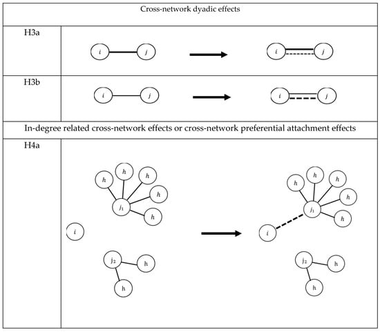 This section proposes four main hypotheses to discuss the multiplex coevolution of the two networks of FTAs and PAs. The first two are related to conventional features of extradyadic interinfluence within each network: (i) transitive ties or triadic closures and (ii) network popularities or preferential attachments [1,25]. The last two are related to multiplex networks or cross-network effects: (iii) cross-network dyadic influences and (iv) cross-network preferential attachments as extradyadic influences.