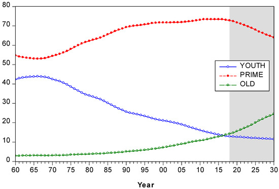 Age structure, particularly population aging, affects the economy in various aspects. It could cause a decline in the rate of economic growth by lowering the labor-force participation and saving rates [3]. It could also affect consumption, investment, money demand [4], domestic savings, the current account [5] and the financial and money markets [6,7,8,9].