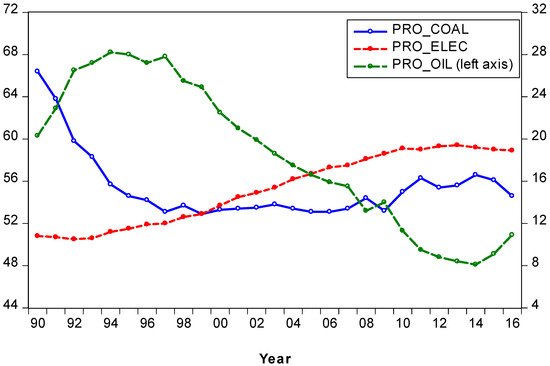 Due to the previously mentioned advantages of electricity, the demand for electricity has risen rapidly. Figure 2 shows the proportion of final energy consumption in Korea by its sources [34]. The green line (left axis) accounts for the oil consumption, and the blue and red lines (right axis) account for the coal and electricity consumption, respectively. In the past, oil and coal were the larger proportion, but as time went by, electricity consumption increased gradually. The graph shows the clear downward trend of oil, which reached its highest value of 68.2% in 1994 and declined to the lowest value of 48.1% in 2014, a huge drop of about 20%. Coal recorded 26.4% in 1990 but declined by 11.8% and ends up at 14.6%. Unlike the other two energy sources, electricity shows an upward trend. In 1990 electricity was only 10.8% of total final consumption, which was much less than coal consumption. However, it has increased gradually and was recorded as about 20% in 2016, which is almost double the 1990 value.