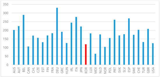 The International Energy Agency (IEA) [35] gives us the statistics of the residential electricity price for 30 OECD countries (Figure 4), and the Korean price is ranked at the 4th lowest level. The sample mean is approximately $185/MWh and the Korean price is $119/MWh. Even Japan, a neighbor of Korea, records $222/MWh, which is almost double.