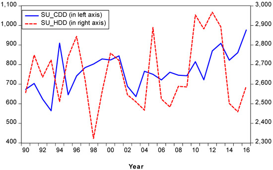 The higher the value, the greater the cooling and heating demands are. According to the statistics, CDD recorded 674 in 1990 and rose by 45% to 976 in 2016. HDD reached 2557 in 1990 and rose by 16% to 2967 in 2012. We can observe the upward trend in both indicators, although there are some fluctuations.