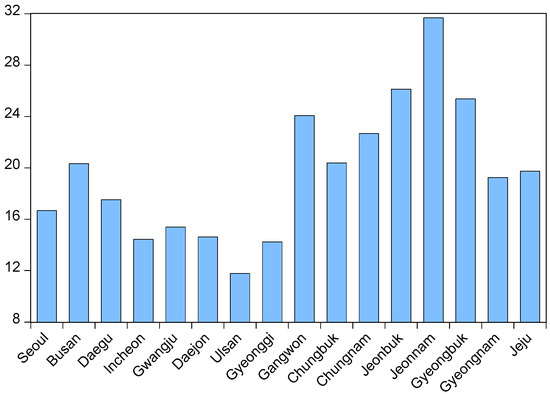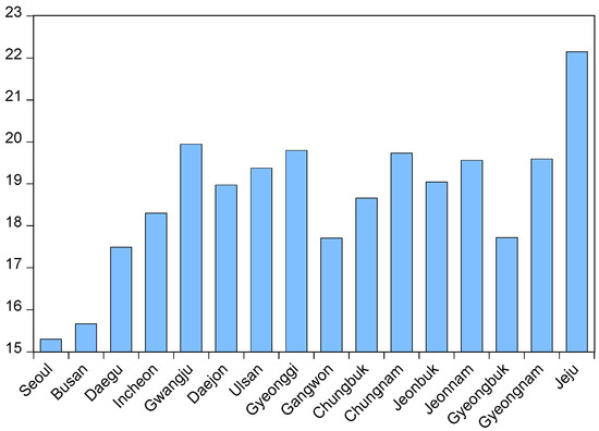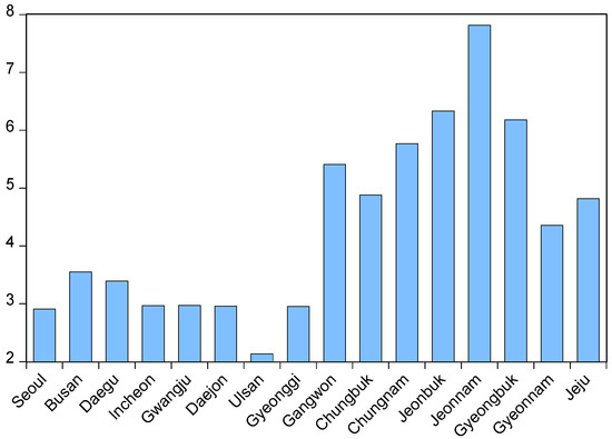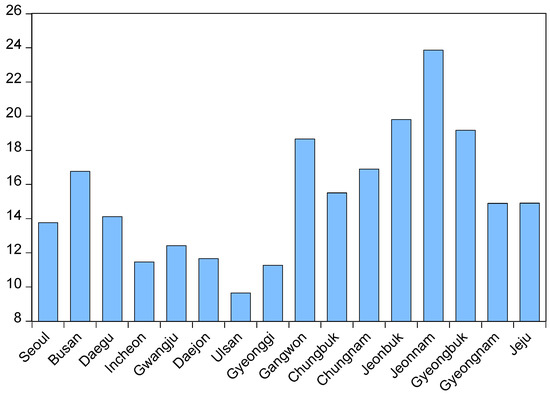 The data we use for the empirical analysis are divided into three groups. The first group is energy and economic variables, the second group is climate variables, and the third group is demographic variables. For the energy variables, we use residential electricity consumption (E), residential real electricity price (RP), and the consumer price index (CPI) for oil products (OP). For the economic variable, we use the real value (Y) of the gross regional domestic product (GRDP) in 2010. The data for regional residential electricity consumption is obtained from the Korea Energy Statistical Information System (KESIS) of Korean Energy Economics Institute (KEEI) [39]. We create the residential electricity price in real terms by deflating the nominal residential electricity price from the Korea Power Exchange (KPX) [40] by regional CPI obtained from the Korean Statistical Information Service (KOSIS) [41]. The CPI for oil products and GRDP are taken from the KOSIS [41,42] (In Korea, urban natural gas is widely used for heating, and can be a substitute for electricity. However, the regional level gas price is not available. Korea practically imports total fossil fuel from overseas, and the correlation between the national price level of oil and gas is over 0.96, so we have chosen the regional oil price for general substitutes).
