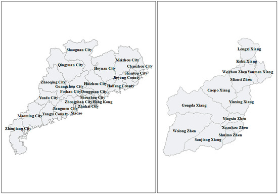 The system of bureaucracy between donors and aid recipients in this PADAA process was similar to a “top-down” tree structure [23], pairing administrative regional divisions in Guangdong and Sichuan from top to bottom, i.e., from the province down to the city, district, county, and town level. Guangdong was scheduled to help Wenchuan reconstruct, and it delegated tasks downward to the prefecture level (Figure 2, Table 2). In other words, one city district was arranged to help one village in the town.
