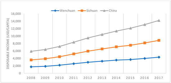 Furthermore, the disposable income of urban residents in Wenchuan County increased substantially and steadily between 2007 and 2017 (Figure 4). However, the disposable income is still lower than that of Sichuan and China, because Wenchuan had high poverty rates until 2018. In fact, the incidence of poverty dropped from 6.8% before the earthquake to currently 0.65%.