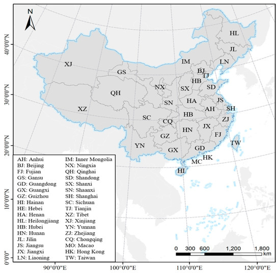 According to the parameters required in the Gompertz function, this study proceeds as follows. (1) We first estimated Gompertz models with different parameters using data from OECD countries, and then found appropriate models for the growth trend of vehicles for provinces in China. (2) Based on productivity convergence behaviors across economies, the labor productivity growth of provinces can be predicted. We predict the population growth rate and the employment rate of each province based on the characteristics of the population structure and employment participation rates. Finally, we get the potential growth rate of GDP by adding up the three rates and calculate GDP per capita for each province from 2020 to 2050. (3) We forecast future vehicle ownership for each province using the suitable Gompertz function. (4) We investigate the causes and factors that can affect the variation of vehicle ownership trends in different provinces. Figure 1 shows the map of China with the location of each province.