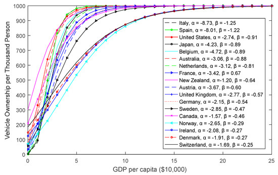 where represents the number of vehicles per 1,000 people in region i in year t; represents the saturation level of vehicle ownership (vehicles per 1000 people) in region i; is GDP per capita in region i in year t; and and are negative parameters that determine the shape of the S-curves. The parameter α determines the demand of vehicle ownership at low or zero economic levels and the parameter β is a curvature parameter that controls the slope of the Gompertz function at high economic levels. The increase of α and β would lead to a steep S-shaped curve against the economic factors. Taking a log-linearization of Equation (1), we can get the following Equation: