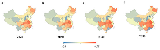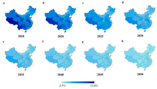 Then we use the corresponding predictions of the proportion of population aged 15–64 in China published in World Population Prospects: 2017 to get the estimated value of China’s employment rate in 1978–2050, and then calculate its change rate. Additionally, in order to keep in line with the change of China’s employment population data, we adjust the growth rate of the employment rate of each province to make sure that the annually averaged growth rate of the employment rate of each province equals the nation-level value. Finally, Equation (6) is used to calculate the growth rate of the labor force in provinces from 2020 to 2050.