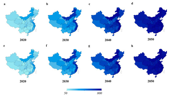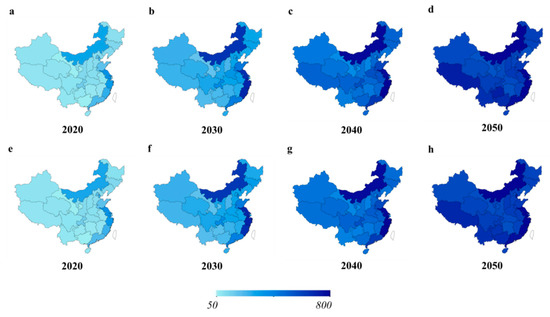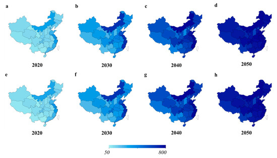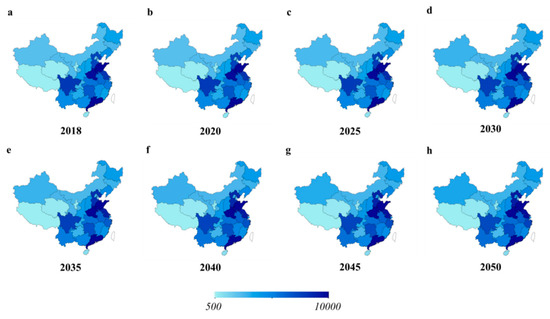 Figure 4 represents the results of the population forecast using the linear model and we can know that the distribution of population across province will not change greatly. We estimate the real GDP for each province for the next 30 years based on the estimated growth rate of GDP. GDP per capita can also be calculated combining with the population estimation. Table A1 shows the GDP per capita distribution of each province at different stages. In general, the real GDP per capita of each province is less than 20,000 US dollars in 2017. The highest level appears in Tianjin, which is about 19,000 US dollars, and the lowest level appears in Gansu, which is only about 4600 US dollars. GDP per capita of each province will increase every year, such that the GDP per capita in most provinces is about 50,000–90,000 US dollars by 2050.