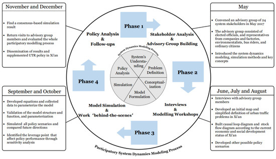 We used the methodology illustrated in Figure 1, based on the PSDM approach, in conjunction with the UTR policy assessment in order to engage stakeholder participation in Xi’an. The research was performed in four phases which are briefly described below. The chronology of model development and stakeholder interaction was summarized in Table A1.