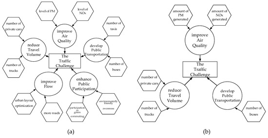 Before July 2017, our research team held several meetings with advisory group members to brainstorm the key challenges in this case. According to their insights/knowledge, group members presented the following solutions: adding more roads, optimizing urban layout, encouraging public participation in green commuting, as well as reducing the motor vehicle travel volume and travel time (hexagons in Figure 2a). Solutions can be divided into five main problem dimensions including traffic flow, traffic volume, air quality, public transportation and public participation (circles in Figure 2a). This diagram was used to facilitate further discussion about how the system works, and it was eventually simplified by the advisory group into three problem dimensions and measures (circles in Figure 2b). The simplified definition of problems including improve air quality, reduce travel volume and develop public transportation, which covered important concerns from the Transportation Bureau, the Environmental Protection Bureau and the public. Simplified problems can be measured by the SD model, and related to specific policies.