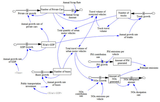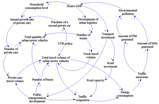 Based on problem dimensions and measures, Figure 3 shows the causal loop of urban traffic system models. As the objective of UTR policy in Xi’an, the total travel volume of urban motor vehicles is determined by the number of private cars, buses, and trucks. Traffic congestion is influenced by the total travel volume of urban motor vehicles, public transportation, and road capacity. UTR policy will limit the total travel volume of urban motor vehicles and stimulate the willingness of purchasing a second private car. An increase in traffic congestion, which in turn stimulates energy consumption and traffic pollutant emissions including nitrogen oxides (NOx) and PM. Increasing environmental pollution will reduce the city’s GDP; then decreasing GDP inhibited private car purchases, urban logistic development, and transport investment. The promotion of the city’s GDP will increase transportation investment, including public transport and road construction. The increase in the number of buses and the enhancement of road capacity will alleviate traffic congestion and thus reduce traffic emissions. The number of taxis accounts for a small proportion of the total urban motor vehicles in Xi’an; therefore, the number of taxis was not considered in the system model.