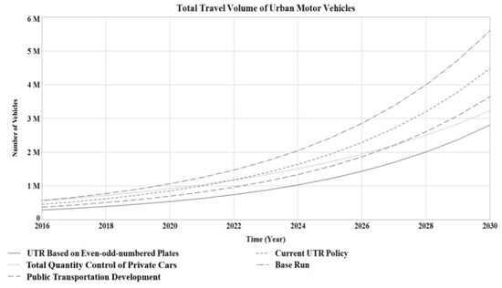 Reducing the total travel volume of urban motor vehicles is the most important goal of the UTR policy in Xi’an. Therefore, in the third phase, we first simulated the model with this goal, and then we assessed the policy leverage point with sensitivity analysis and the overall trends of the policy scenarios selected by the advisory group members. The specific simulation design is presented in Section 3.2.