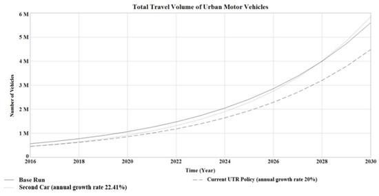 The sensitivity analysis considered variables that influence system behavior [59]. As Meadows [60] observed, in a sensitivity analysis the value of a small shift in one variable can create considerable changes in the whole system performance, this is called a leverage point. For this reason, the annual growth rate of private cars was adjusted to be in the interval [0.2, 0.25] by using Vensim DSS, so to obtain the leverage point at 22.41%. As shown in Figure 6, after UTR policy causes the annual growth rate of private cars to increases from 20% to 22.41%, the travel volume caused by the purchase of a second car will reach 5.85 million by 2030, surpassing the current UTR policy of 1.37 million units. A more serious implication of this result is that the travel volume will exceed even the base run in 2028. In the long run, the purchase of a second car aggravates road congestion and vehicle emissions in Xi’an, thus deviating from the original goals of the UTR policy.