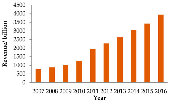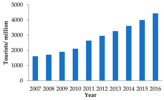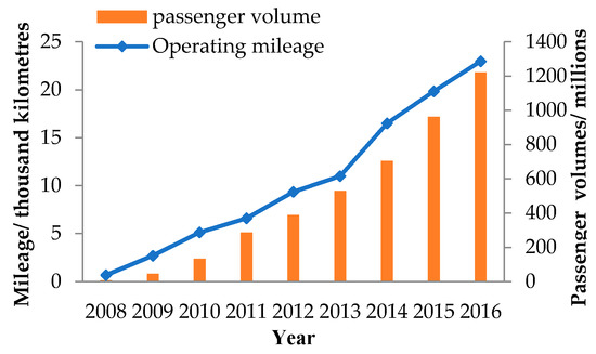 China, as the second largest economy in the world, has the largest population and the third largest territory. The country has developed rapidly in terms of GDP, tourism, HSR and civil aviation. In recent years, its economy has developed rapidly, and its GDP has grown from 10 trillion yuan in 2000 to 90 trillion yuan in 2018. Living standards and tourism have improved significantly as well. Chinese domestic tourists and tourism income are developing rapidly (as shown in Figure 1 and Figure 2), which brings about huge population flows and transportation consumption. China’s HSR has also achieved tremendous success. Since 2008, China’s HSR has evolved significantly in terms of mileage and passenger volume (Figure 3), becoming an important part of China’s high-speed passenger transport system. In 2016, China’s HSR transported 1221.28 million passengers, 2.8 times as many as air transport (which transported 436.34 million domestic passengers). The rapid development of China’s economy, tourism, and HSR will certainly have an impact on the development of its air transport network.