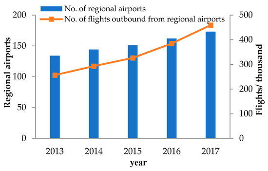 According to the statistical standards of “Statistical Data on Civil Aviation of China 2017,” passenger volume is above 300,000 per year for main routes in China. The air transport network consisting of these routes and city-pairs is called CMATN in this paper. CMATN is primarily located in the eastern and central regions, where the economy and tourism have developed rapidly. From 2007 to 2010, CMATN accounted for more than 70% of China’s domestic total passenger volume, showing an upward trend (Figure 4). However, since 2011, the passenger volume ratio of CMATN has begun to decline. This is because of the continuous development of China’s regional airlines. China has invested in the construction of new regional airports and regional flights have flourished (Figure 5), which has promoted the increase in total air passenger volume. HSR competition has also led to tremendous changes in public travel [54]. However, the impact of HSR on CMATN’s passenger volume is significant. China’s HSR operation areas overlap with those of CMATN’s, and the impact on CMATN’s passenger volume is significant. Both are concentrated in the densely populated, economically developed, and tourism inclined central and eastern regions, as shown in Figure 6.