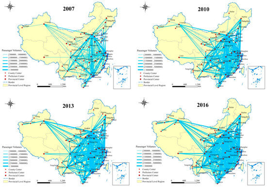 Recently, China’s economy has exhibited rapid development. The air transport industry has also developed vigorously, and new routes have become members of CMATN on a regular basis. Figure 8 shows CMATN in 2007, 2010, 2013 and 2016, and we determine its changing process in the following.