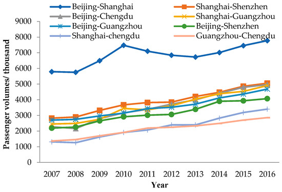 2. In terms of network nodes, there are several core cities in the network. Throughout the development process of CMATN, Beijing, Shanghai, Guangzhou, Shenzhen, and Chengdu are important cities in terms of the number of routes and passenger volume. Kunming, Xi’an, and Chongqing have also become important transit cities due to the subsequent development. There are six routes for which passenger volumes always exceed all other routes, as shown in Figure 9. Compared with Chengdu–Shanghai and Chengdu–Guangzhou, which ranked seventh and eighth, the other six routes had larger passenger volumes. Among them, Beijing–Shanghai has always registered the largest passenger volume. Despite the opening of the Beijing–Shanghai HSR on June 30, 2011, it has had a limited impact, and air passenger volume on the Beijing–Shanghai route continues to exceed that of Shanghai–Shenzhen by nearly 3 million people. This gap is significant. Beijing, Shanghai, and Guangzhou are China’s economic and cultural centers, as well as China’s international hubs. They have played an important supporting role in the development of CMATN. Kunming, Xi’an, and Chongqing attract tourists from domestic and foreign locations with their unique tourism characteristics. The development of economy and tourism has promoted the development of China’s air transport network and made CMATN more prosperous.